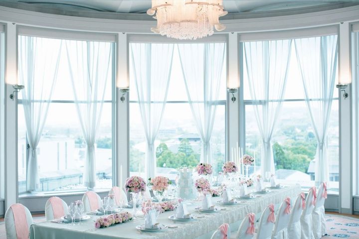 白いテーブルクロスとチェアカバーにパウダーピンクのアクセントをプラス。明るく柔らかな色合いが会場を優しい雰囲気で包みます。