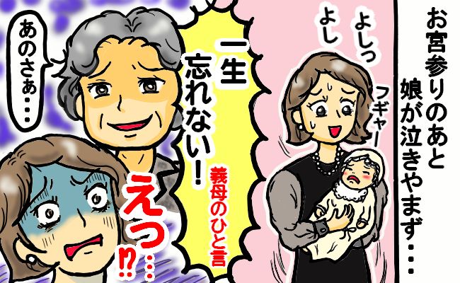 娘が生まれて1カ月が過ぎたころ、私の両親と義両親のみんなでお宮参りに行きました。帰りに娘が泣きやまなくなり……、それを見た義母から衝撃発言がとびだしました。