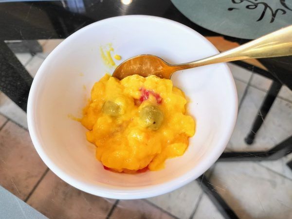 右:マンゴーカスタード 中央:ライタ(ヨーグルトソース) 左:サラダ
