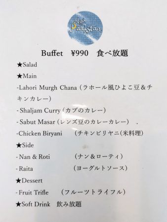 ランチタイムは食べ放題のみとなっており、内容は日替わりのようです。 伺った日のビュッフェメニューはこちら。