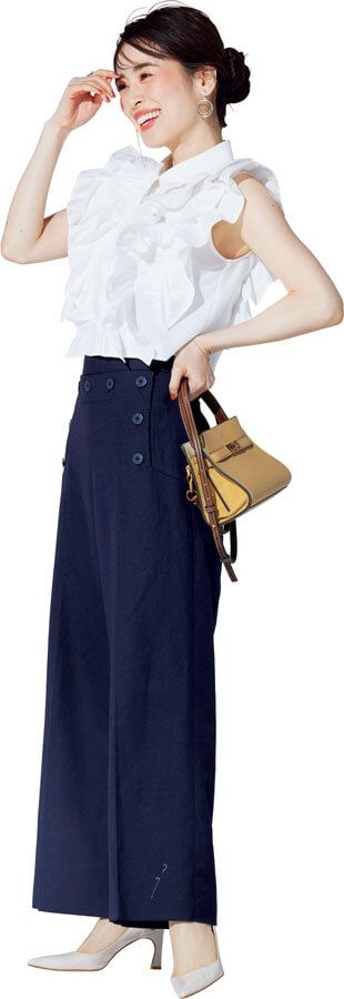 ブラウス¥10,450/31 Sons de mode(ヒロタ) パンツ¥27,500/ドレステリア(ドレステリア 渋谷スクランブル スクエア店) バッグ¥99,000/トリー バーチ(トリー バーチ ジャパン) イヤリング¥15,400/ランバン オン ブルー(ヴァンドームヤマダ) ブレスレット¥11,000、リング¥11,000/ともにアンテプリマ(アンテプリマ そごう横浜) シューズ¥35,200/PIPPICHIC(ベイジュ)