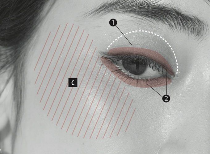 アイホールにA1を広げたら、二重幅と下まぶた広めに2を塗る。優しい発色のシャドウに合わせてアイラインもなじませることがコツ。