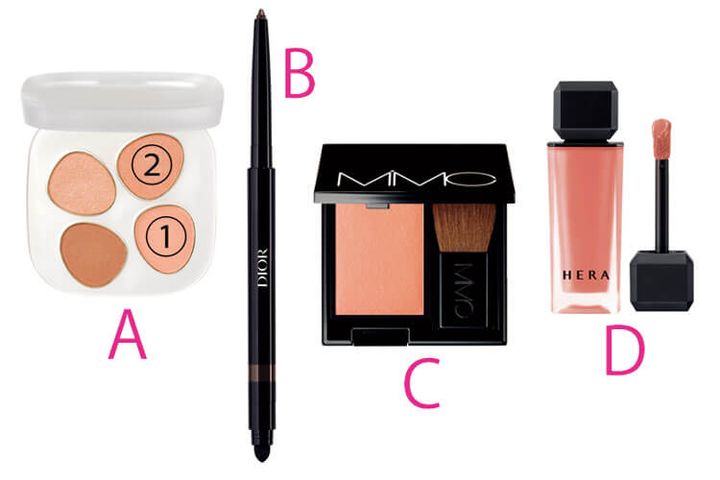 A.トーン ペタル フロート アイパレット01 ¥4,180/トーン B.ディオールショウ スティロ ウォータープルーフ 781 ¥4,510/パルファン・クリスチャン・ディオール C.MiMC ミネラルスムースチーク 06 ¥4,400/MIMC D.ヘラ センシュアル パウダー マット リキッドN 213 ピーチシック ¥4,840/HERA(アモーレパシフィックジャパン)