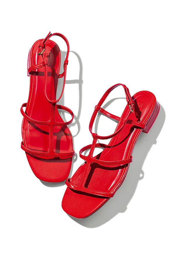 ぱっと目を引く真っ赤なサンダルは、旬のフレンチシックコーデと好相性。フラットタイプでヘルシーに。