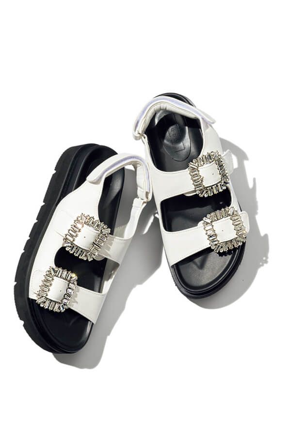 アッパーとソールの黒白のバイカラーがスタイリッシュ。シャープなカットのビジューもモード感があっておしゃれ。