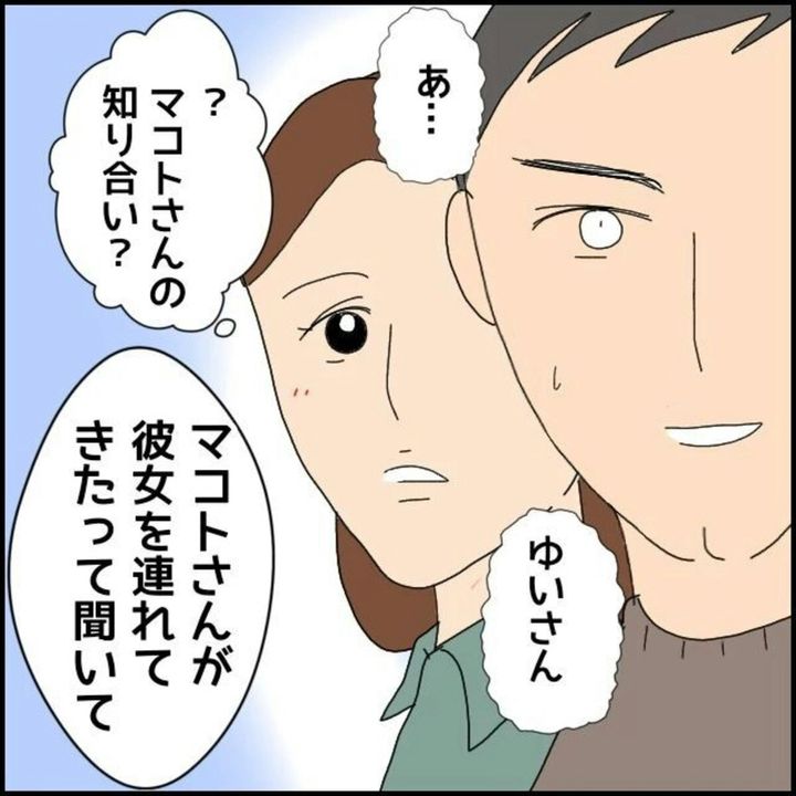 飲み会の席に突然やってきて、不穏な笑みを浮かべながらあいさつをする女性に、マコトは少し動揺した様子です。一体彼女は何者なのでしょうか。