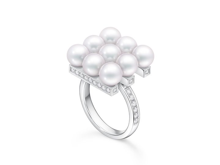 パヴェダイヤモンドを敷き詰めたバーにパールを並べ、積み木のように一列一列積み上げたかのような遊び心溢れるフォルム。