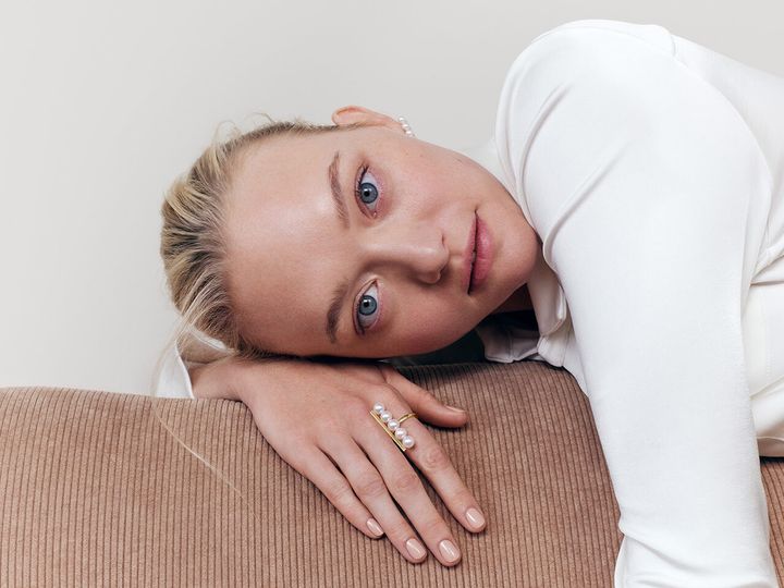 ジェマ・ワードの人差し指で5珠のパールが整然と並ぶ姿に、思わずうっとりと見惚れてしまいそう!