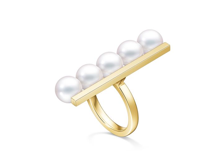 5珠のあこや真珠が並ぶ「バランス」のイエローゴールドのバーを縦向きにして、スタイリッシュに仕上げたこちらのリング。