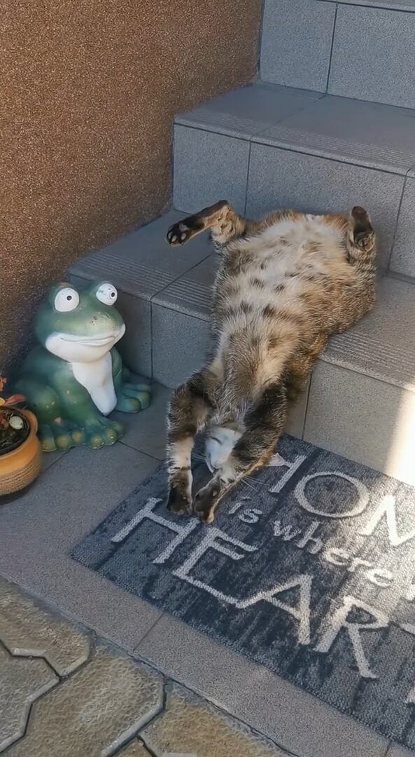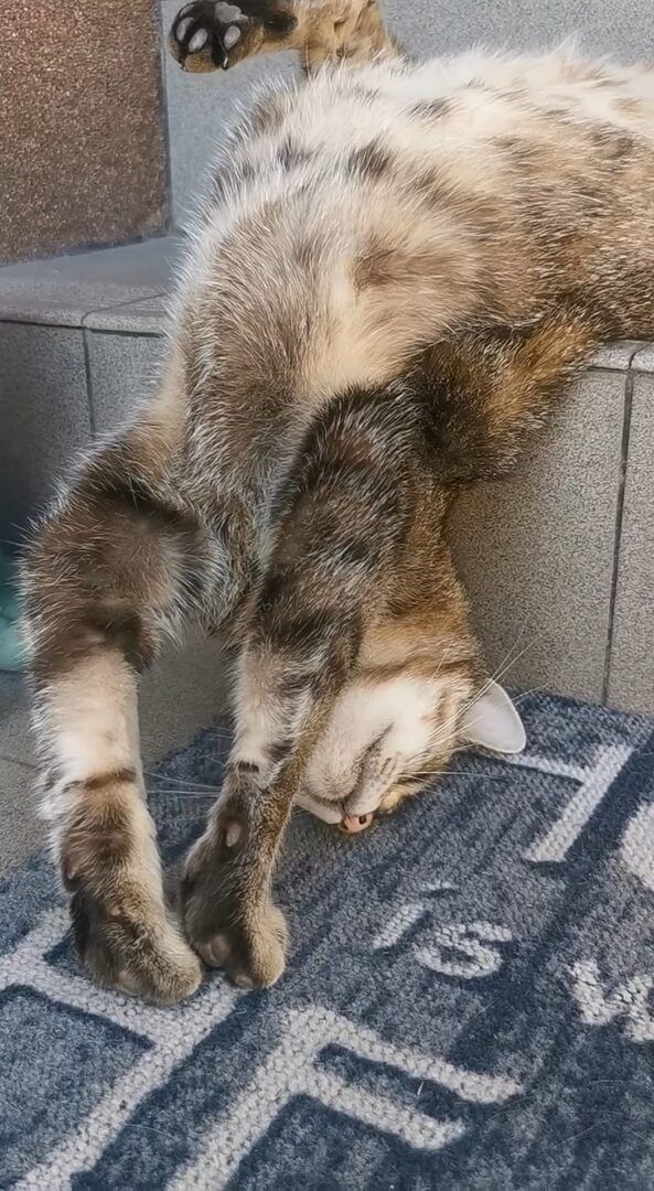階段の途中で眠ってしまったネコ。 仰向けになったその寝相は、なかなかスゴいことになっています!