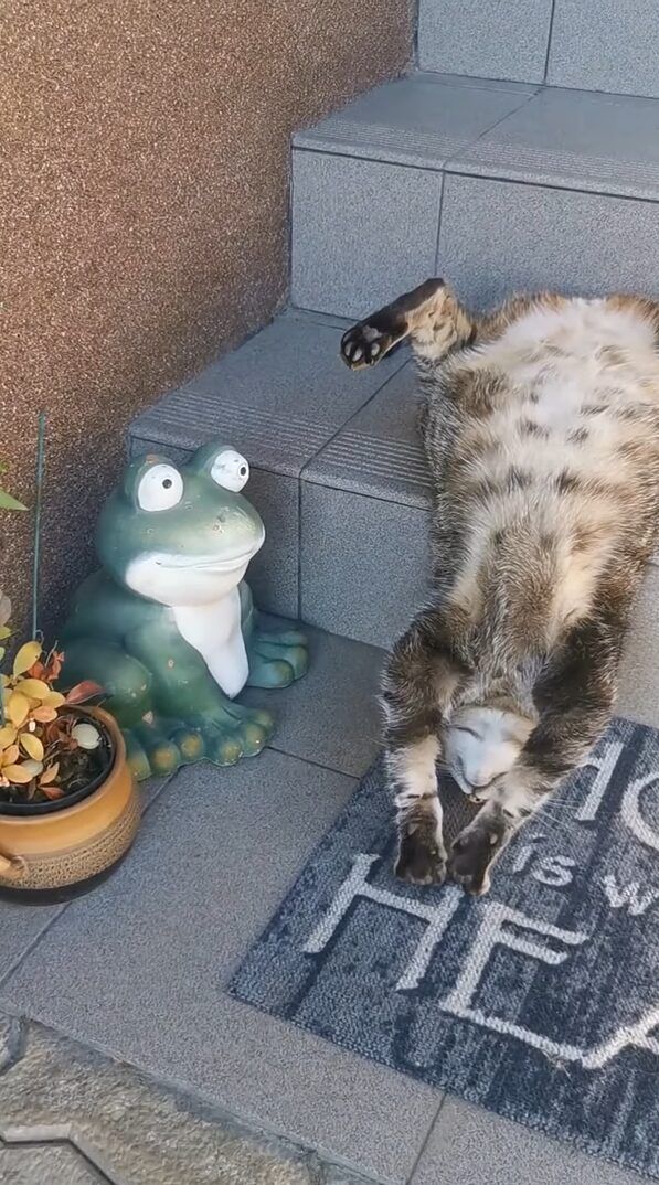 その隣にはカエルの置物がありますが、スゴい姿勢で眠ってしまったネコをビックリして見つめているみたいですね。