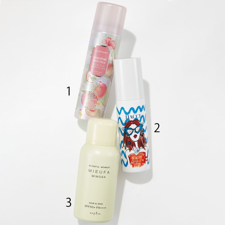 新作の甘爽やかなミモザの香りは、ピュアで可愛らしい印象に。コロンとしたボトルも魅力。ミーファ フレグランス UV スプレー ミモザ SPF50+・PA++++ 80g ¥1,320(ナプラ)