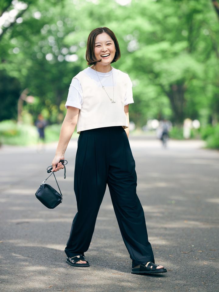 「私にとってもはや制服のワイドパンツ。仕事の日も休日も毎日穿いています。いくつも持っていますが、こだわりは丈。スニーカーと合わせる前提で選ぶなら少しだけ靴にかかるように、ヒールを合わせる前提なら長め丈を選ぶとバランスがいい気がしています。今日は、この夏穿くのを楽しみにしていたスイムジャージーパンツ。暑い日でも快適に過ごせそうで、ヘビロテの予感です」加藤綾美さん・164㎝/会社員(3歳と7歳男の子ママ)