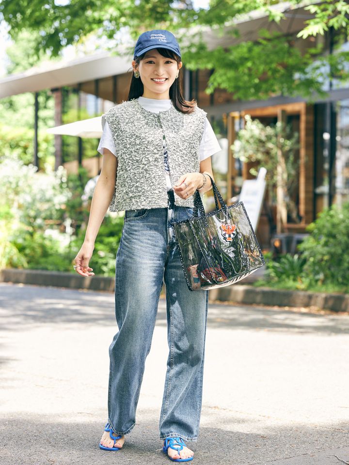 「選びのポイントは裾の広がり具合い。あまりにワイドだと上半身が貧相に見えたりカジュアルすぎる気がして、ほんのり広がっているラインを選ぶようにしています。このデニムは一見ストレートデニムのように見えるのでキレイめに着られてジレとの相性もいいなと思いました。このデニムでワイドパンツに目覚めたので、ほかにも自分の体型に合うものを今探しているところです」天野結香さん・160㎝/主婦(3歳男の子と6歳女の子ママ)