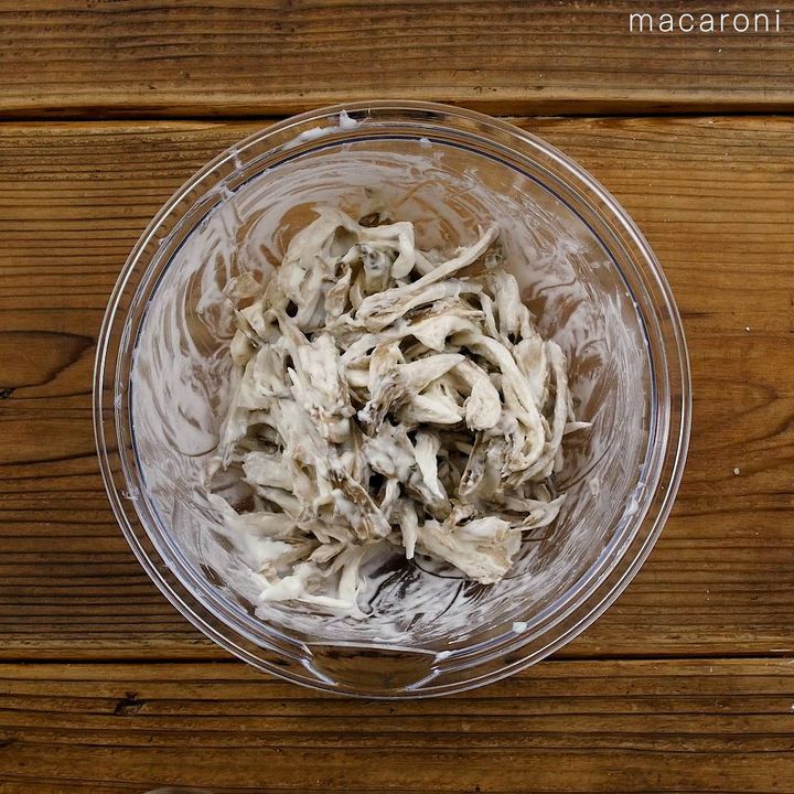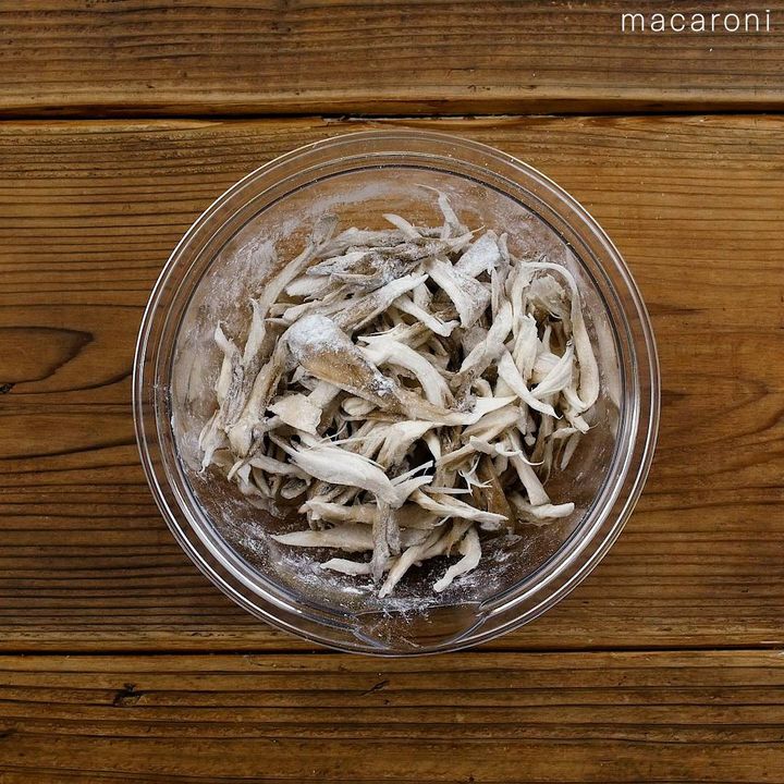 3: 別のボウルに残りの小麦粉、冷水を混ぜ合わせて③のまいたけを合わせます。
