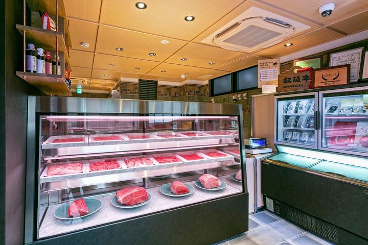 新社屋の1階には精肉店「精肉銀座本店」を配置。昔ながらの水冷式冷蔵庫や、外観からも見える骨付き肉の追熟用冷蔵ショーケースを設置し、高品質な和牛を提供。2階は飲食店「肉処」として、すき焼き、しゃぶしゃぶ、ステーキに加え、新たに焼肉とせいろ蒸しの5種類のコースを用意する。3階は「肉割烹」だ。カウンター席を中心に板前が目の前で調理する、季節の素材と厳選和牛を楽しめる空間に仕立てた。