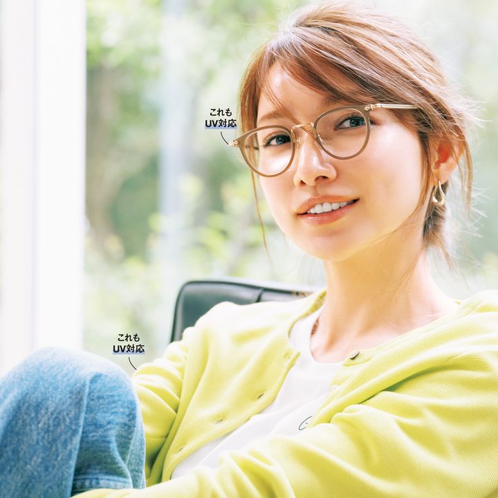 UVカットカーディガン¥14,850(アーバンリサーチ ロッソ/アーバンリサーチ ロッソ グランフロント大阪店)メガネフレーム¥52,800 ※UVカットレンズ¥8,800~(アイヴァン/アイヴァン 東京ギャラリー)Tシャツ¥7,480(ストラ)デニムパンツ¥25,300(レッドカード トーキョー/ゲストリスト)ピアス¥5,500(ミミサンジュウサン/サンポークリエイト)