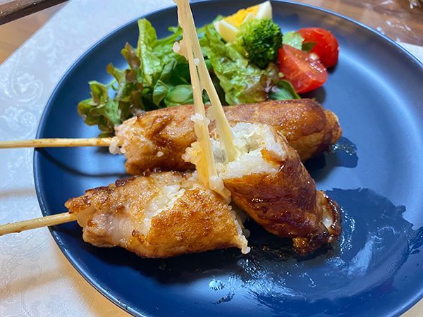 • 2.ラップの上にご飯を広げ、割り箸に刺したチーズをのせ、ご飯で包む