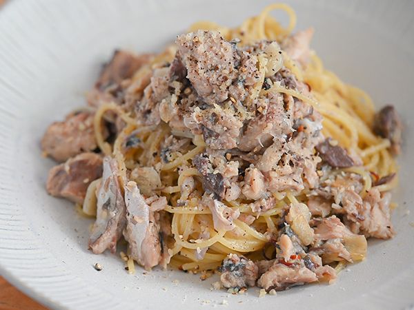 • 3.ニンニクが色付いてきたら中火にし、サバ缶を缶汁ごと加えて5分間加熱する
