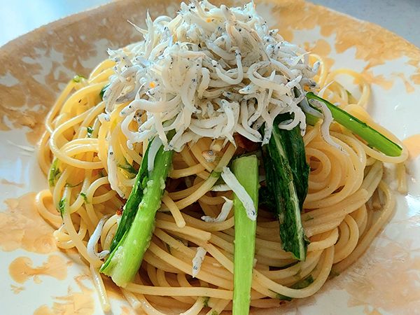 • 1.ニンニクとショウガ、小松菜、しらすの半分をオリーブオイルで1分程炒め、だしパックで味付け。塩味が足りない場合は味付け塩こしょうを足す