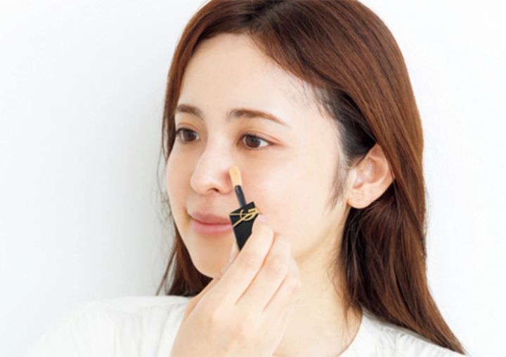 1. Cのコンシーラーを、小鼻の横や肌の赤みが気になる部分に塗布。先に濃い色を塗ることで、少量でもしっかりカバーしてくれます。
