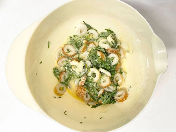 1.  ちくわ、青じそ、[A]をボウルに入れたら、ボウルを振って薄力粉をまぶすようにします。