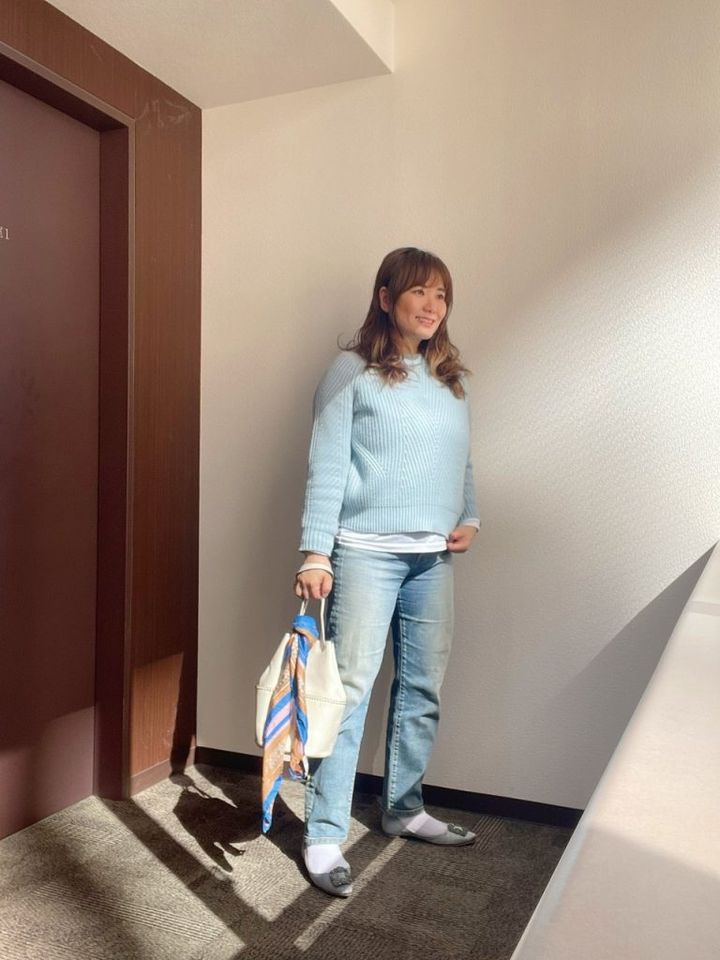 「水色のワントーンはぼやけやすいので、ニットから裾出ししたTシャツやソックスでパキッとしたクリアな白をプラス。これだけで、淡いトーンの着こなしにメリハリが出ます。ビジューつきのシューズやバッグにつけたスカーフで華やかさを足しました」(ライター佐藤かな子さん)