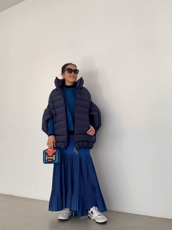 「ネイビーやブルーは、昔から大好きな色!鮮やかな発色がお気に入りのHeRIN.CYEのプルオーバーとプリーツスカートで、ブルーのワントーンコーデにしました。鮮やか色でも潔くワントーンで着れば、意外と難しくないし失敗しない気がします。10年選手のネイビーのモンクレーのポンチョダウンとヘビロテ中のニューバランス550で、カジュアルな抜け感をプラス。バッグはブルーに合う、カラフルな配色のものを選びました」(ライター濱口眞夕子さん)
