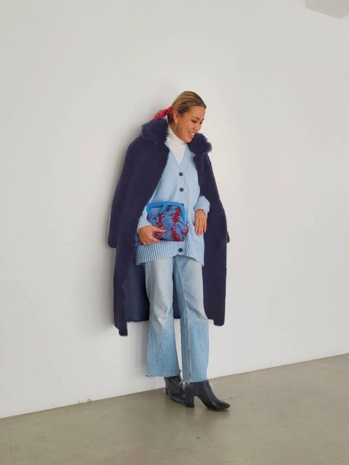 「ライトブルーのデニムに水色のニットカーデで、明るいブルーのワントーンコーデに。ぼやけた印象にならないよう、アウターとブーツはネイビーで引き締めました。バッグの柄やヘアアクセサリーでちょっとだけ“赤”を取り入れて、スパイスを加えました」(スタイリスト 濱口沙世子さん)