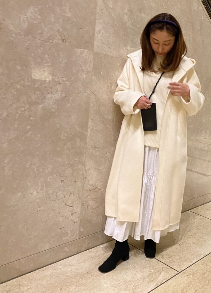 「ワントーンコーデは、朝、コーデに悩まなくていいのでよくやります。パッと華やかな印象になれる冬のオールホワイトスタイルは、ニットやコットンなど素材の異なるものを重ねて、単調にならないように工夫。スマホポシェットとショートブーツで“少量の黒”を効かせてメリハリを出しました」(ライター 坂本結香さん)