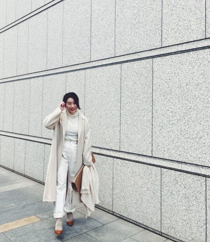 「白は膨張しやすいので、オールホワイトの日は少しでも縦に長く見えるよう工夫します。白の中でもトーンの異なるものを重ねることで、立体感が生まれて細く見えやすいと思います。アイボリーの服と相性の良いベージュ小物を合わせて、優しく引き締めてみました」(ライター棚田トモコさん)