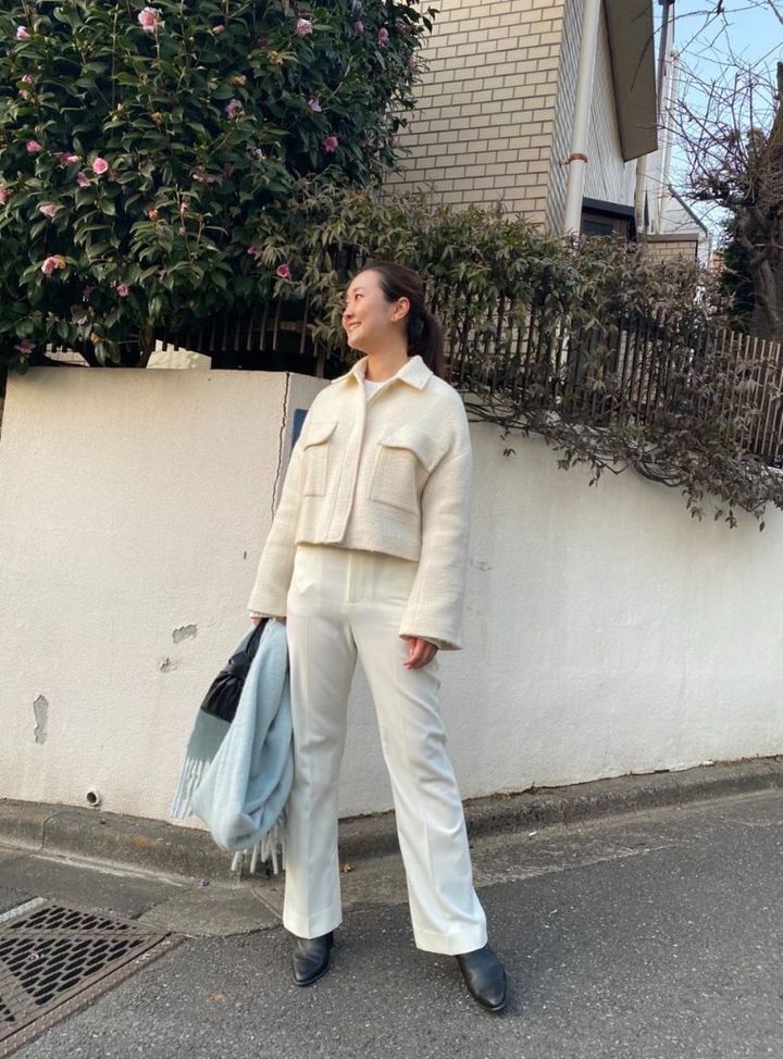 「オール白の着こなしは気分転換にもなるし、周りからも春らしいねと褒めてもらうことが多いです。白でもほっこりさせず、シャープな雰囲気で着たかったのでショート丈のコートとセンタープレス入りのパンツですっきりとまとめました。上半身をコンパクトすると、白でもスタイルアップして見える気がします」(ライター広田香奈さん)