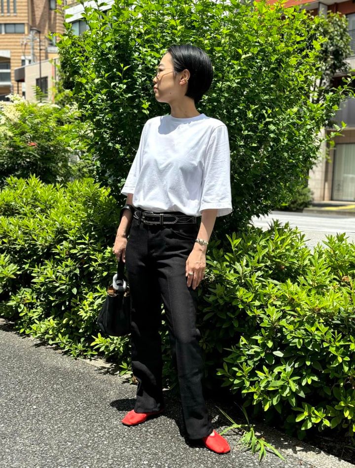 センタープレス入りのキレイめなブラックデニムを主役にしたモノトーンコーデは、足元に差した真っ赤なシューズが鍵。さらにメッシュ素材にするだけでグッと旬のムードに。