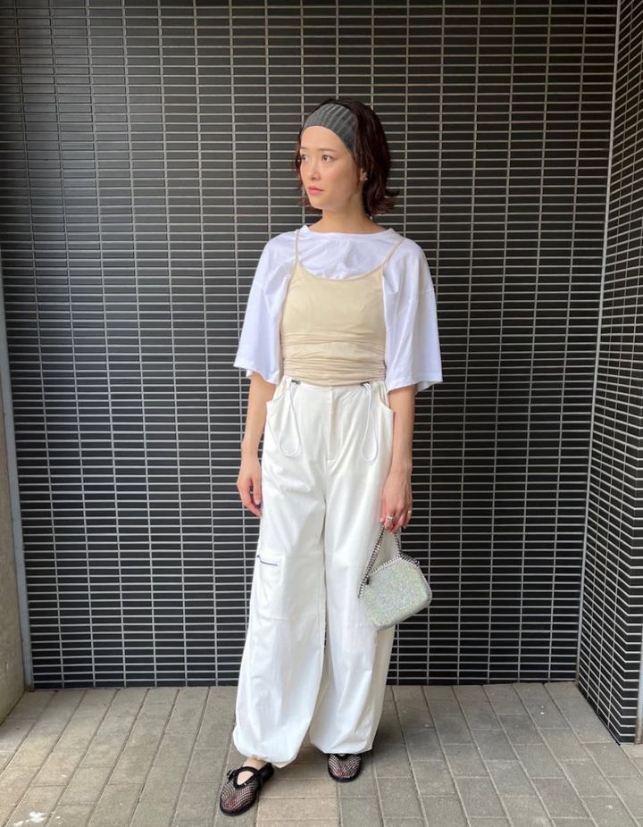 こちらも足元は大人気のアライア。ホワイトのワントーンをブラックで引き締めながらも重くならないメッシュ素材が秀逸。小物使いに個性が光ります。