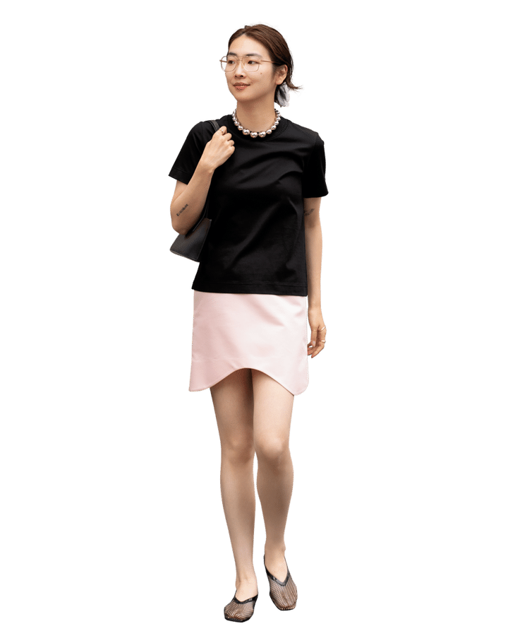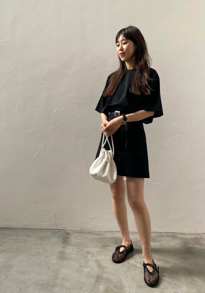 シンプルなワンツーコーデもユニークなデザインのミニスカートが個性たっぷり。足元はラフなフラットシューズながらヌーディなメッシュ素材で足長効果も♪