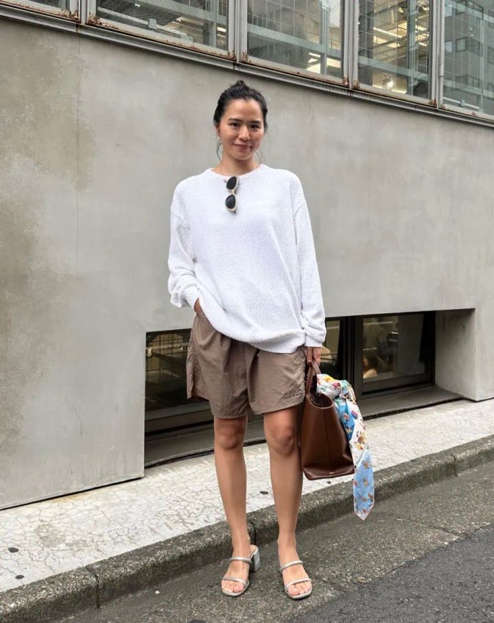 ベージュのワントーンでまとめたスタイリングは異素材使いでメリハリを出すのがポイント。コッパーカラーのサンダルで全体になじませながらも存在感のある足元に。