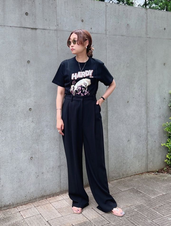 プリントTシャツがポイントのオールブラックは、シルバージュエリーに合わせて足元もシルバーでリンク。カジュアルな中にほんのりハードなムードも漂う、大人のTシャツスタイルに。