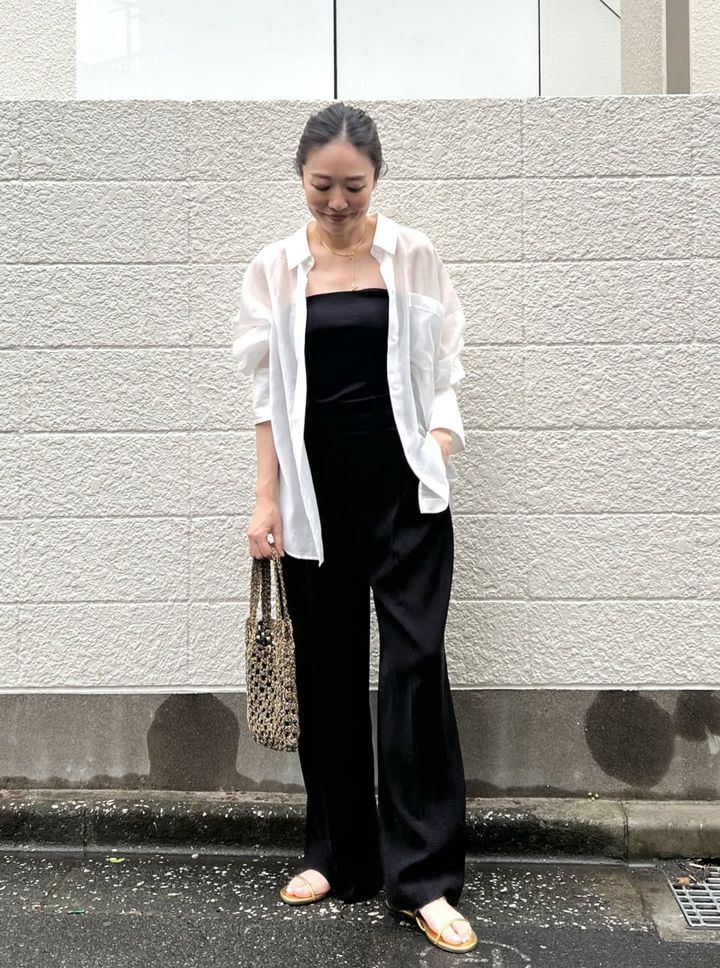 クールなモノトーンコーデも、小物をゴールドカラーにするだけで、グッと女性らしく温度感のある着こなしに。重く見えがちなブラックのオールインワンもサンダルなら軽やかな印象。
