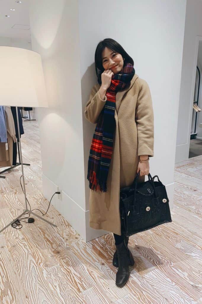 勤務を終えてからインスタで人気の「りなログ」のグルメ取材の前に駆けつけてくれた石井さん。OLさんらしいきちんとコートにチェックのストール使いがポイントに。