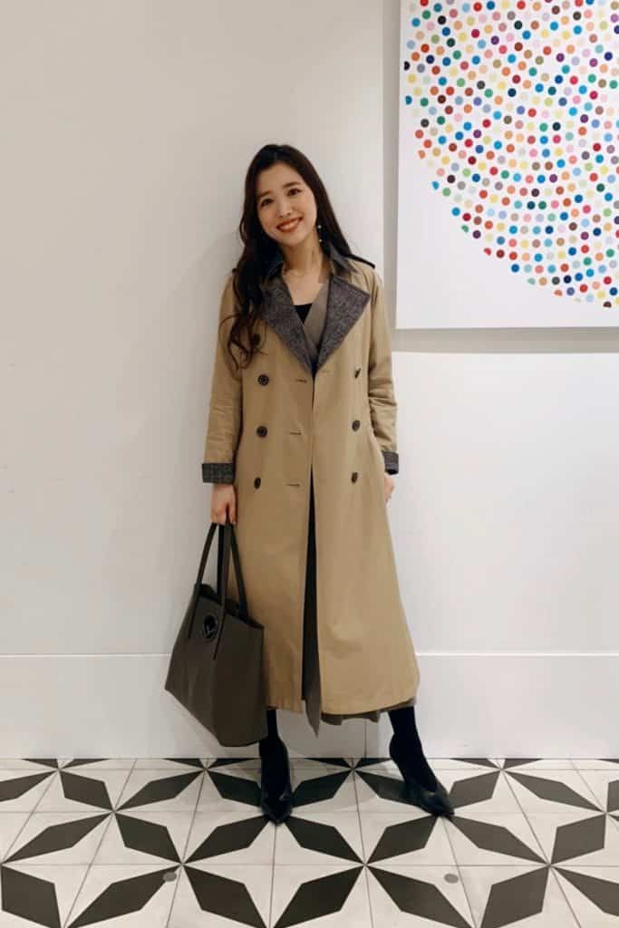 気温9℃で息が白くなるほど冷え込んだ夜。会社帰りの入江さんをスナップ! 入江さんの会社は比較的きちんとした服装の社員さんが多くて、いつもきちんとしたワンピースやスカートスタイルが多いそう。「きちんと見せたいけれど、シンプルすぎは物足りないのでアウターでデザイン性のあるものを選んでいます。グッと冷え込んだ今日はお気に入りのツイード切り替えトレンチを解禁。襟と背中がツイードになっていて、見た目以上に暖かいのもいいんです」コンサバが好きだけど、普通じゃ物足りない元名古屋嬢らしいおしゃれのこだわりが見えました!