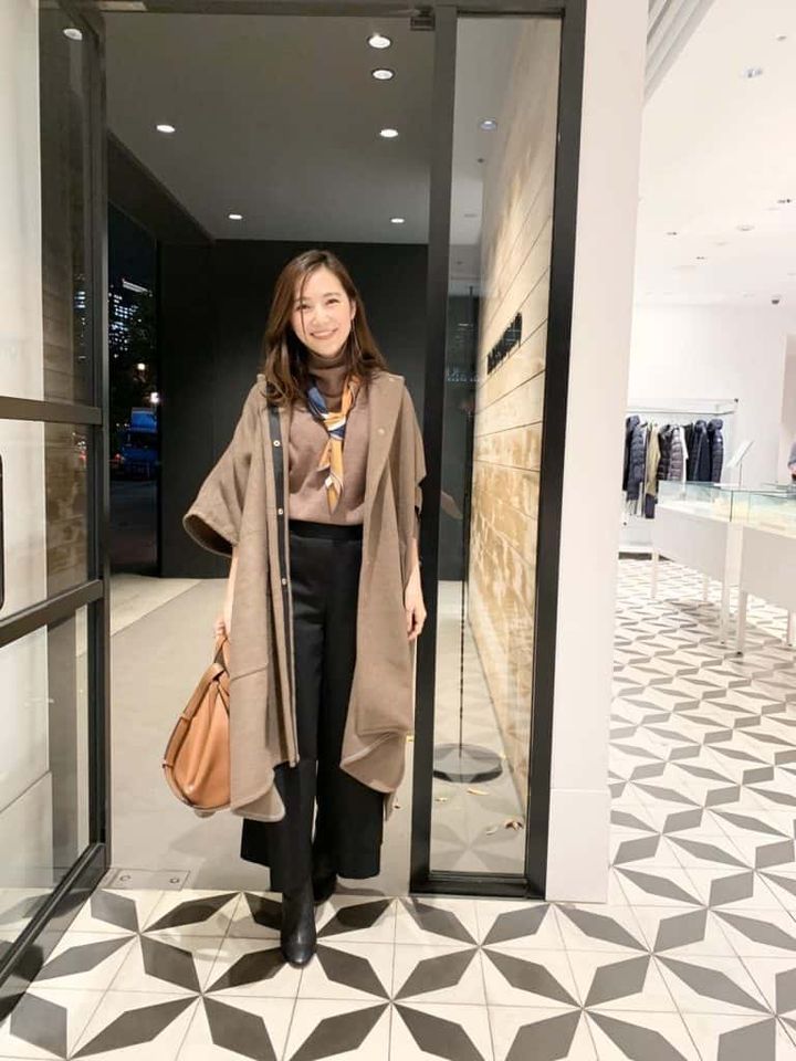 ポンチョコート:MAKE IT ニット:LE JOUR パンツ:TOMORROWLAND ショートブーツ:JIMMYCHOO バッグ:LOEWE スカーフ:ROPE