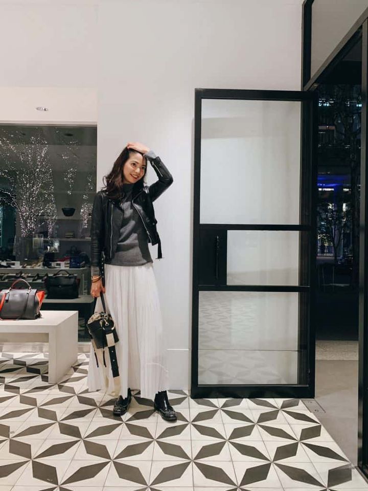 小雨もぱらつく中、丸の内で開かれたアパレルのイベントにやって来た佐藤さん。華やかな会場でも佐藤さんらしいカッコいいモノトーンコーデで注目を集めていました。「室内のイベントなので、アウターを脱がなくてもいいコーディネートを考えました」ニットに重ねると結構暖かいのでこの季節はライダースが便利ですよね! フレアスカートと合わせて、女らしさも高まった大人の甘辛ミックススタイルに仕上がっています。