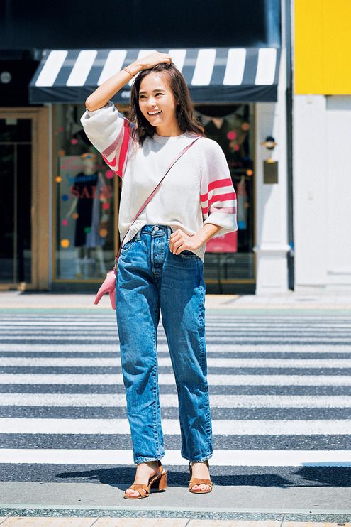 「サマーニットは暑さの残る秋の始まりこそ本当の出番。ゆるいデニムスタイルだからウエストにタックインしてバランスアップ」