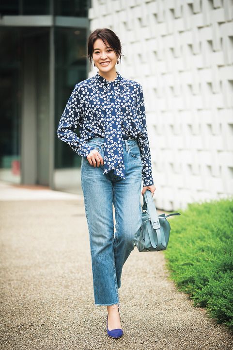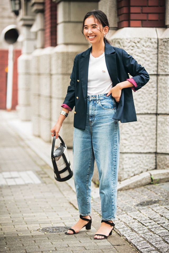 ゆったりしたデニムで王道の紺ブレコーデをアップデートします