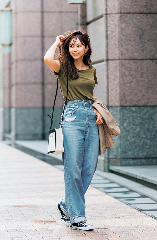 「Tシャツとスニーカーの定番コーデも、デニムを更新することで新しいバランスを楽しめます。秋色トップスと合わせやすい薄色を」