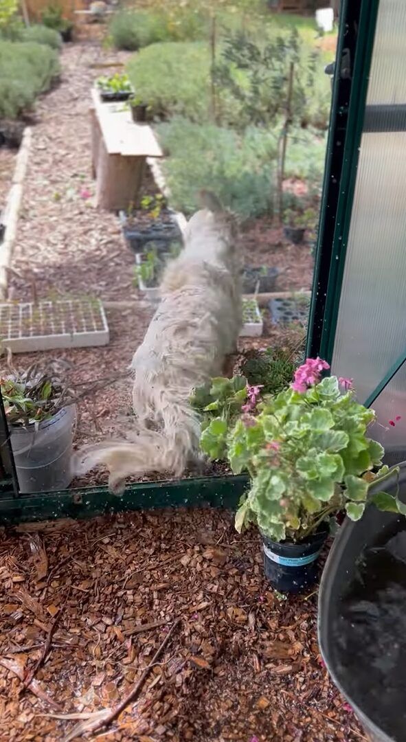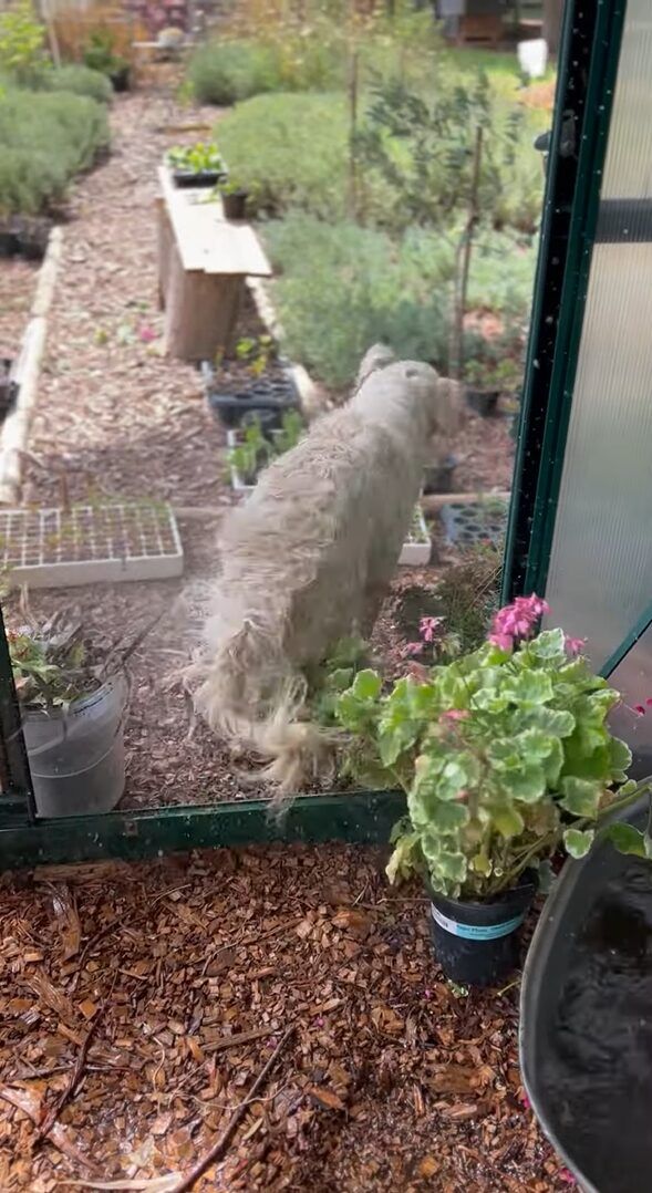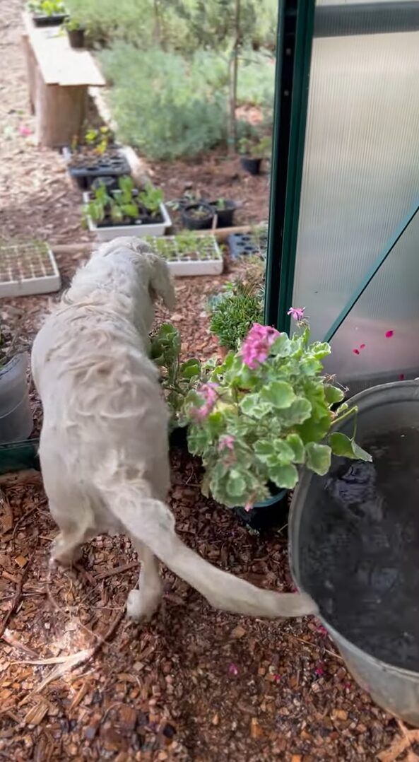3. 温室の水桶に浸かるゴールデンレトリバー。上がってから体をブルブルすれば・・水やりもできちゃう!!【海外・動画】
