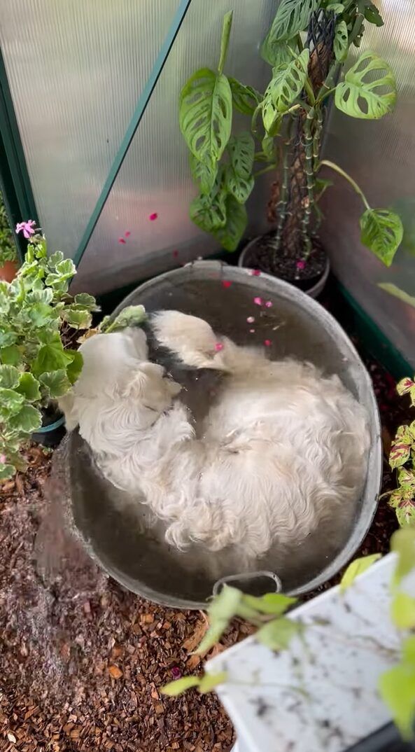 温室に置かれた水桶の中に、お風呂のように浸かったゴールデンレトリバー。 植物に囲まれて、のんびり涼んでいるようです。