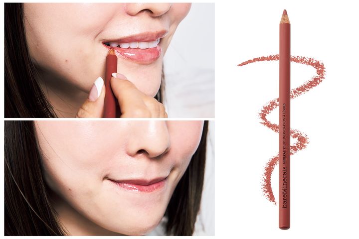 顔の印象がボケてしまうときは口角だけリップペンシルで輪郭を描きます。口角がキュッと上がり、立体感のある口元に仕上がります。リップカラーと似た色を選べば、浮きません。とろけるような、なめらかな描き心地。ミネラリスト ラスティング リップライナー ストライキング スパイス¥3,300(ベアミネラル)