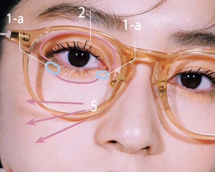 2を上下まぶたにつけたのち、1-aを下目尻と、ほんのり目頭にもオン。4を上下まつ毛に塗る。