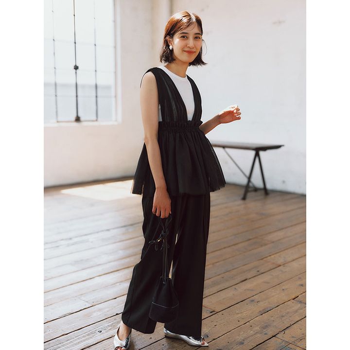 オールインワン¥24,200(ジェマアトリエ)タンクトップ¥7,700(ネイヴ/オンワード樫山)イヤリング¥5,400(アビステ)バッグ¥19,800(ダブルスタンダードクロージング/フィルム)靴¥15,950(ダイアナ/ダイアナ銀座本店)